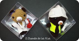 En fin, el caso es que Enrique quería para el cumple de su novia una osita doctora, para que hiciera parejita con el suyo y me puse manos a la obra. Reciclando unos casco de Ipod que mi gato se medio comió, clips de la oficina, masilla y permanente negro hicimos (sí, porque él mismo me ayudó, ha participado bastante en la “Dirección de Obra”…) el fonendo, y le hice también una gotita de sangre tipo mascotita porque es hematóloga. El detalle de los lapicitos me encanta (que me recuerda a un gumi de Aruberu), la batita, el hociquito…toda entera, me encanta!!