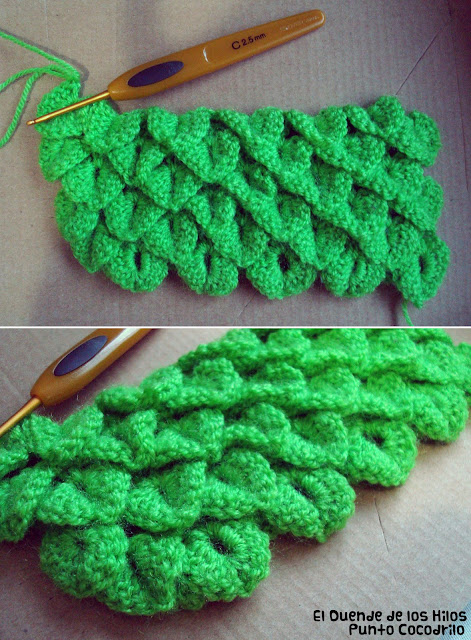 Es bastante sencillo, aunque no lo parezca. Se trata de montar sobre las cadenetas iniciales, grupos de dos puntos altos, dos cadenetas, dos puntos altos y al terminar la vuelta, sobre los puntos altos tejer cinco puntos altos, una cadena, y sobre el punto alto de al lado, otros cinco puntos altos para subir. Es algo distinto a como se suele trabajar en crochet, puesto que tejemos sobre los puntos de la vuelta anterior, pero enseguida se le pilla el truco y queda muy vistoso. Para una bufanda bien calentita queda genial, seguro que os soluciona algún regalo de navidad! Yo me haré una, en un color más discretito que el que use para la muestra, que es un verde rana super cantoso…