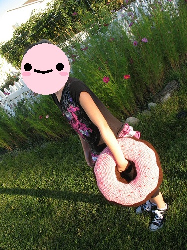 Pese a que en el link original la autora del patrón publica fotos de su nieta, la destinataria del donut, al ser menor he visto necesario guardar un poco su identidad y le he tapado la carilla, no me gustaría que la foto de la chavala anduviera por ahí dando vueltas y lo único que quería era que viéseis el tamaño del super donut…