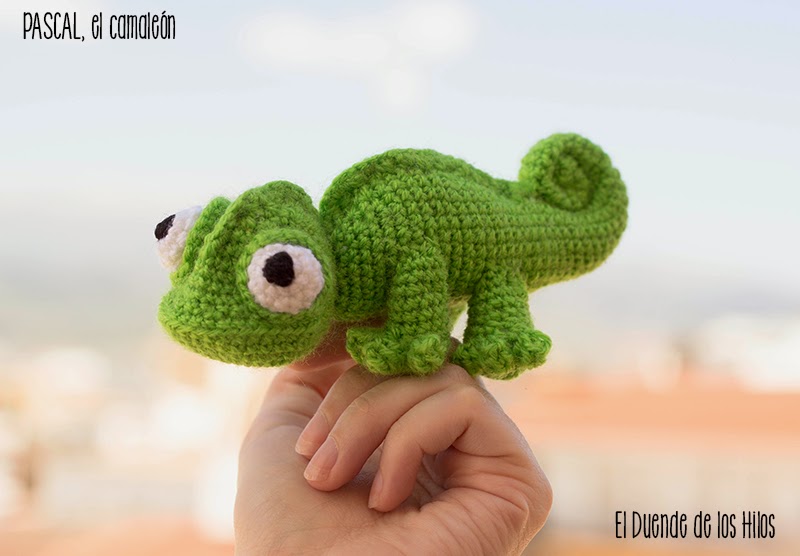 Me encantó cuando lo vi, y supe que tenía que hacer mi versión amigurumi, los primeros intentos fueron… vergonzosos. Tengo que admitirlo, fueron vergonzosos. Al fin lo he conseguido y ¡es super mono! Mide unos 12 centímetros, más o menos lo que podría medir el Pascal real, porque lo he hecho con aguja pequeñitas y lana fina (doble de paciencia!), y un verde super cantoso, el que ya usé una vez para enseñaros el punto cocodrilo. Se ha tirado el pobre un tiempecito sin las patas de atrás por faltar lana y por eso no he podido enseñarlo.