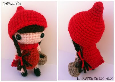 La caperucita tiene su curro, dar con la forma adecuada de la caperuza y la capa ha llevado varios intentos… las trenzas me encantan, tengo que hacer más personajes con trenzas… ^__^ Se me había olvidado la cestita, y ya dándola por terminada mi novio me dijo: “Uyyy le falta la cesta!”