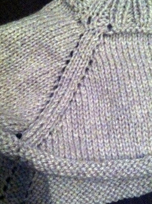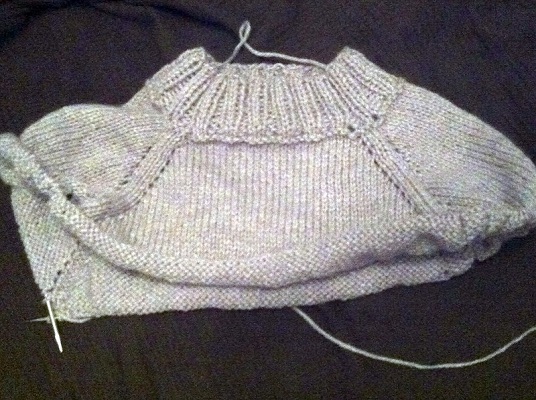 Bueno, como podéis ver, ya se ve parte de la manga ranglan y los aumentos, con esos agujeritos que se quedan al hacer los “yarn over” (un tipo de aumento) para ir añadiendo puntos.